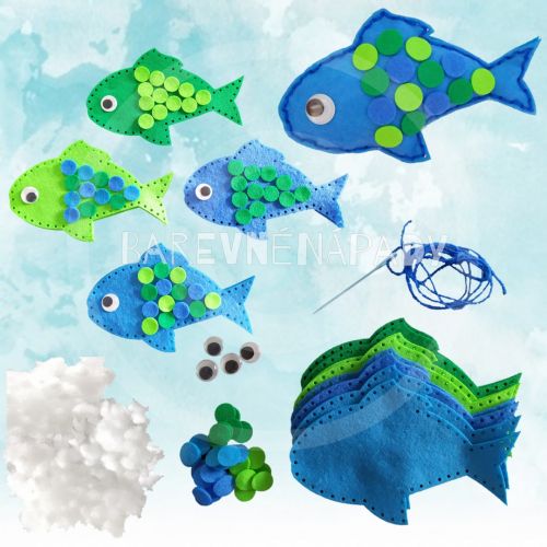 - sada k ušití obsahuje vše potřebné k ušití 4ks rybiček v barevném mixu (2 odstíny modré a 2 odstíny zelené)