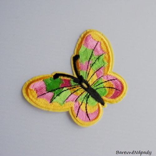 - nažehlovací aplikace / výšivka / záplata motýl v mixu žluté, zelené a růžové barvy s černými detaily