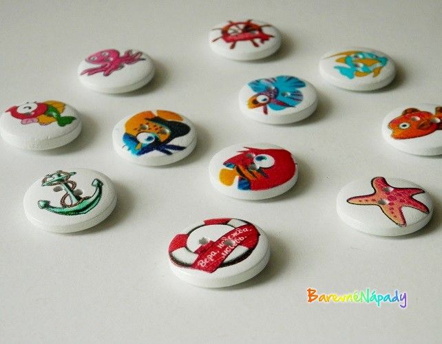 - mix kulatých oblých dřevěných knoflíků s mořským motivem (ryba, chobotnice, hvězdice, záchranný kruh, kormidlo, kotva..)
