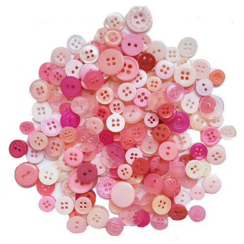 - mix plastových knoflíků v odstínech růžové barvy (syté i transparentní, světlé i tmavé), různé velikosti 6-15mm, různé počty dírek atp.