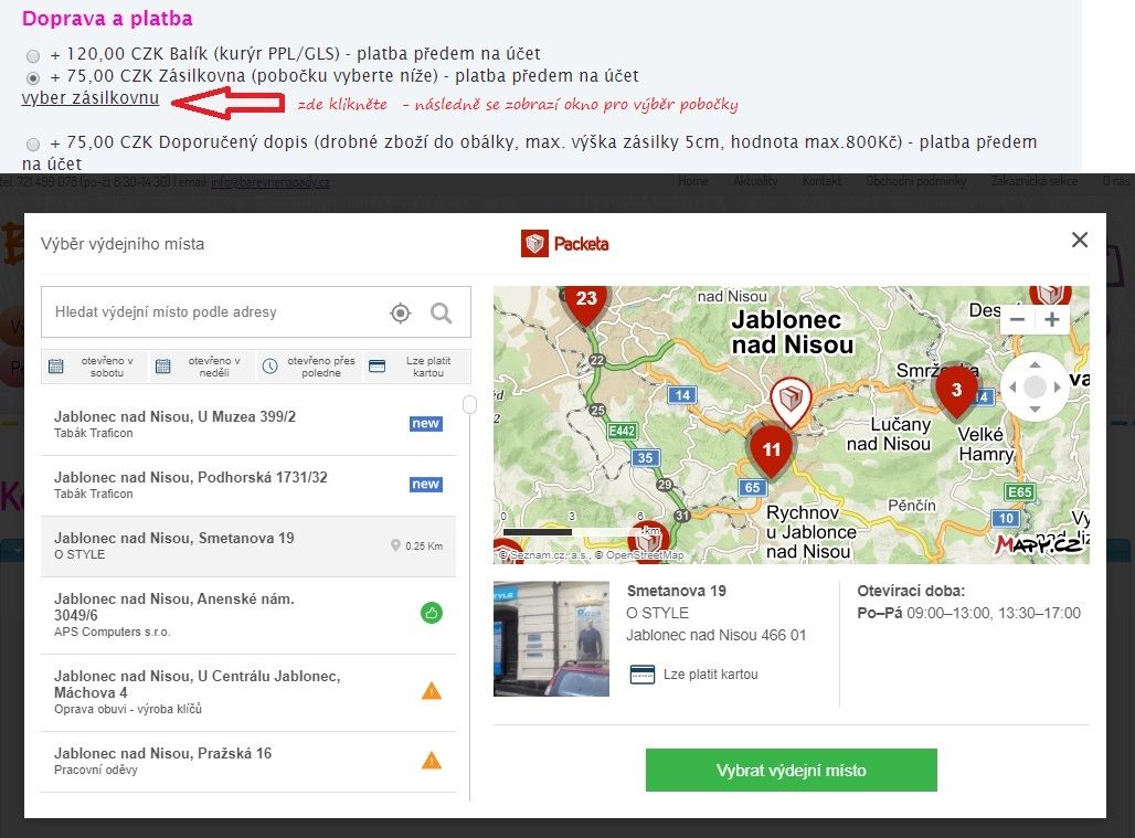 - Jakmile zaškrtnete výběr dopravy do Zásilkovny, stránka se aktualizuje a objeví se podtržený text vyber zásilkovnu - na něj klikněte a zobrazí se okno s mapou a seznamem nejbližších poboček, včetně vyhledávacího okénka - vyhledávat můžete např. podle adresy