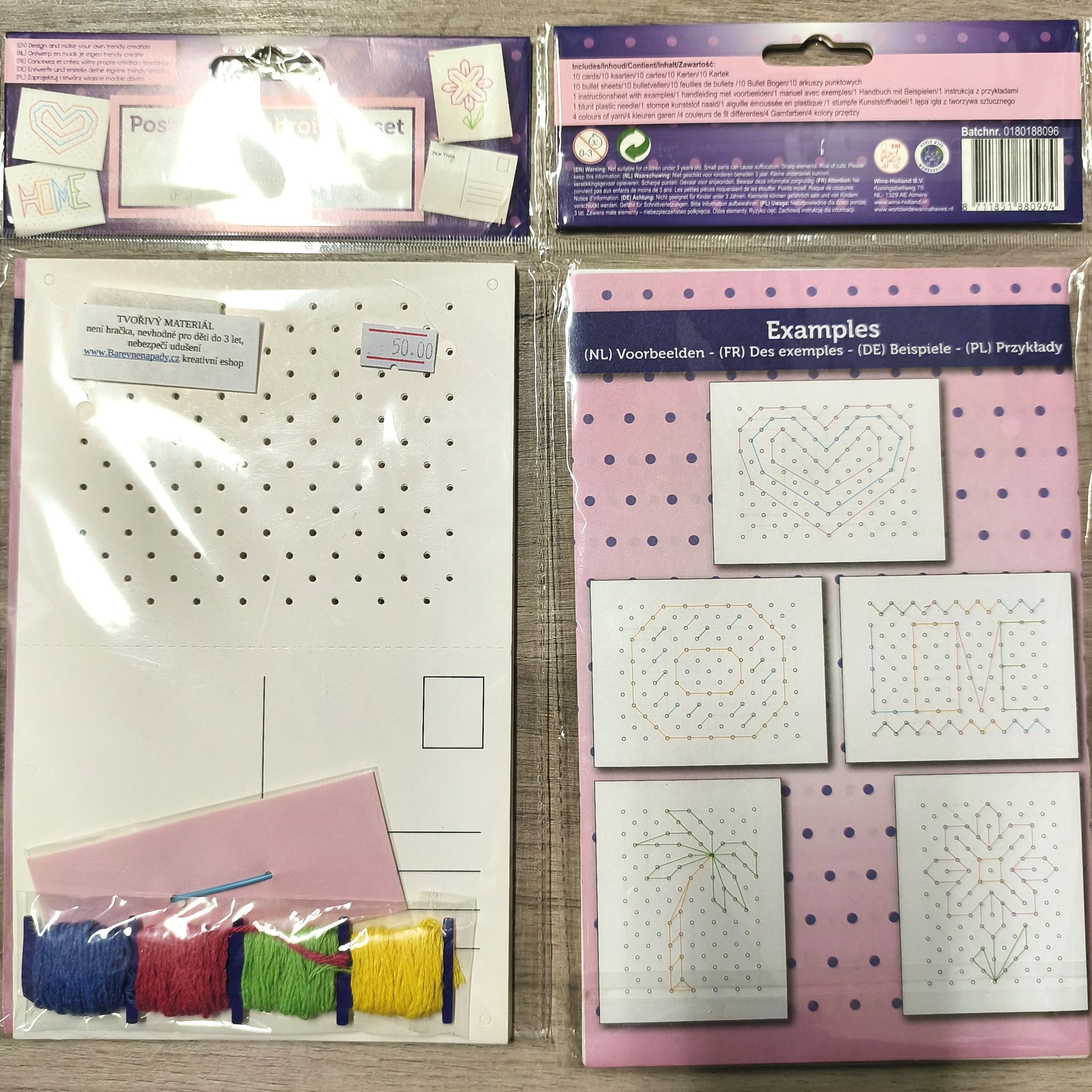 - sada 10ti pohlednic (po složení vel. A6) - z jedné poloviny je karton děrovaný pro vyšívání libovolných vzorů - na obale je příklad několika vzorů pro inspiraci
