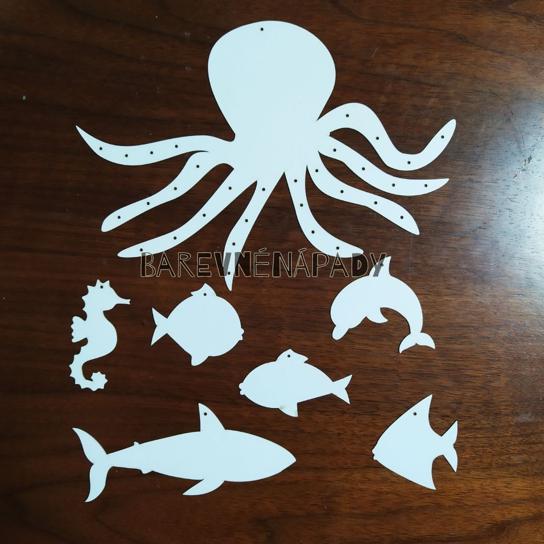 - kreativní sada k výrobě závěsné dekorace obsahuje výřezy ve tvaru chobotnice, žraloka, delfína, mořského koníka a ryby + 5m silonového vlasce